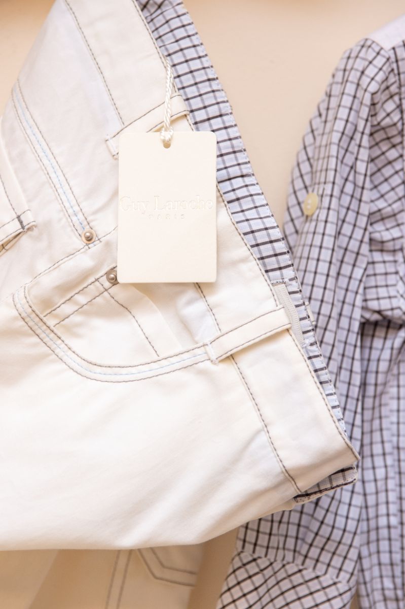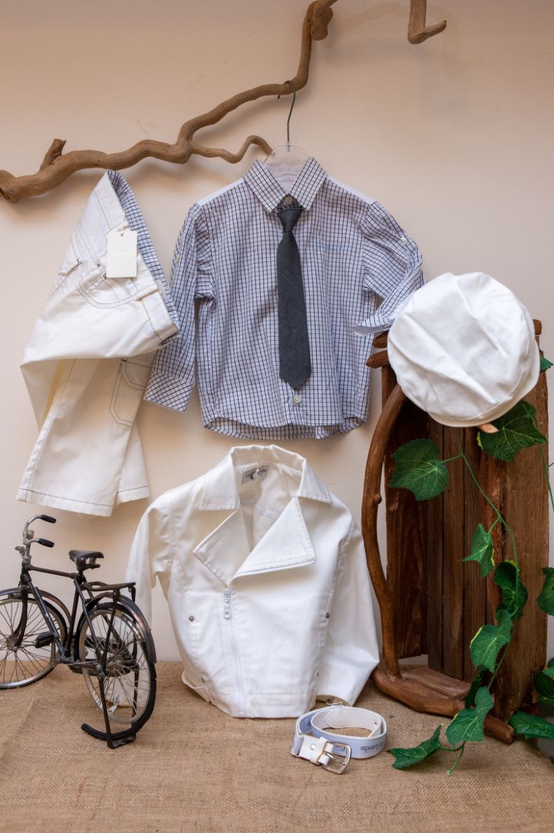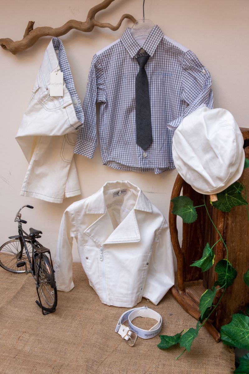 Κομψό και μοντέρνο βαπτιστικό σύνολο GuyLaroche από λευκό παντελόνι, με όμορφο μπουφάν στην ίδια απόχρωση. Είναι διακοσμημένο με υπέροχα κουμπιά και μοναδικές λεπτομέρειες. Αυτό το σετ 6 τεμαχίων (παντελόνι,πουκάμισο, γραβάτα, μπουφάν, τραγιάσκα και ζώνη), είναι μια δροσερή καλοκαιρινή πρόταση για ειδικές περιστάσεις όπως η βάπτιση.