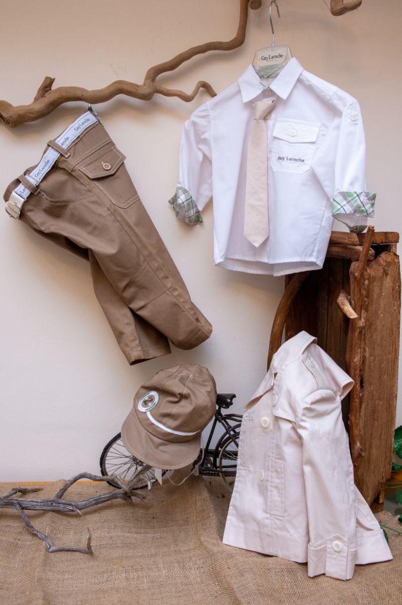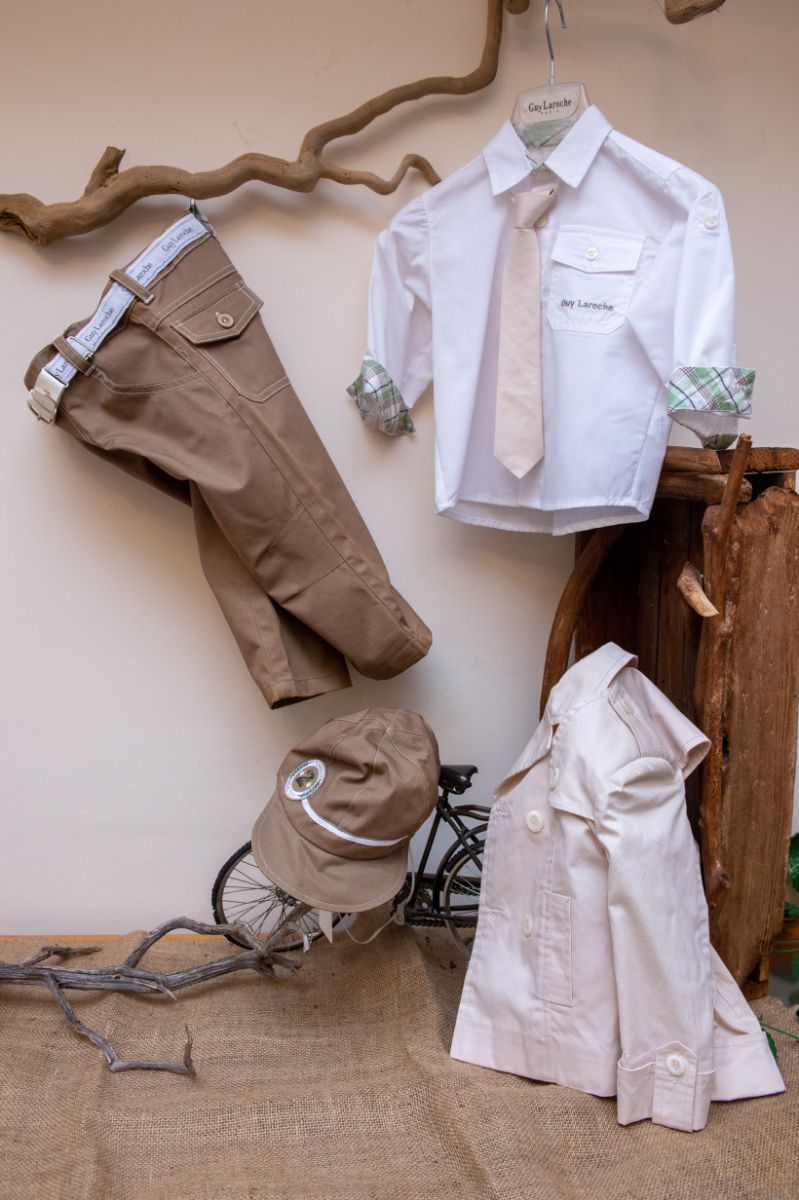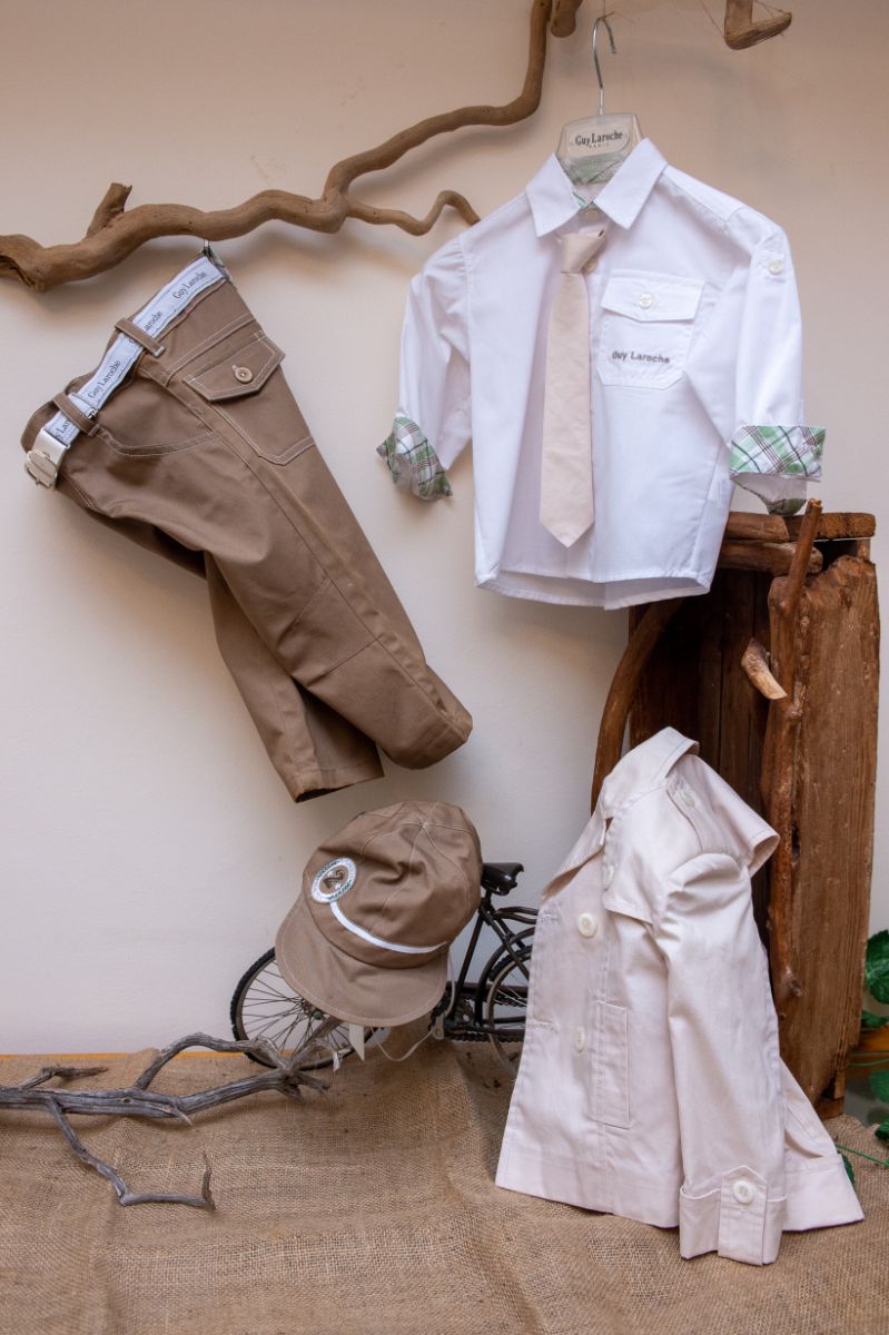 Κομψό και μοντέρνο βαπτιστικό σύνολο GuyLaroche από καφέ παντελόνι, με όμορφη καμπαρντίνα σε απόχρωση του μπεζ. Είναι διακοσμημένο με υπέροχα κουμπιά και μοναδικές λεπτομέρειες. Αυτό το σετ 6 τεμαχίων (παντελόνι,πουκάμισο, γραβάτα, καμπαρντίνα, καπέλο και ζώνη), είναι μια δροσερή καλοκαιρινή πρόταση για ειδικές περιστάσεις όπως η βάπτιση.