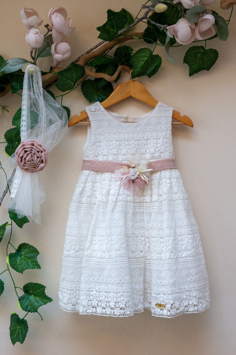 Φόρεμα από βαμβακερή δαντέλα σε ivory χρώμα και χειροποίητη ζώνη σε απόχρωση σάπιο μήλο. Η εσωτερική επένδυση είναι 100% βαμβάκι. Το Persephone είναι ένα υπέροχο φόρεμα για τις κομψές μικρές κυρίες. Χρώμα: ivory. • Βαμβακερή δαντέλα.