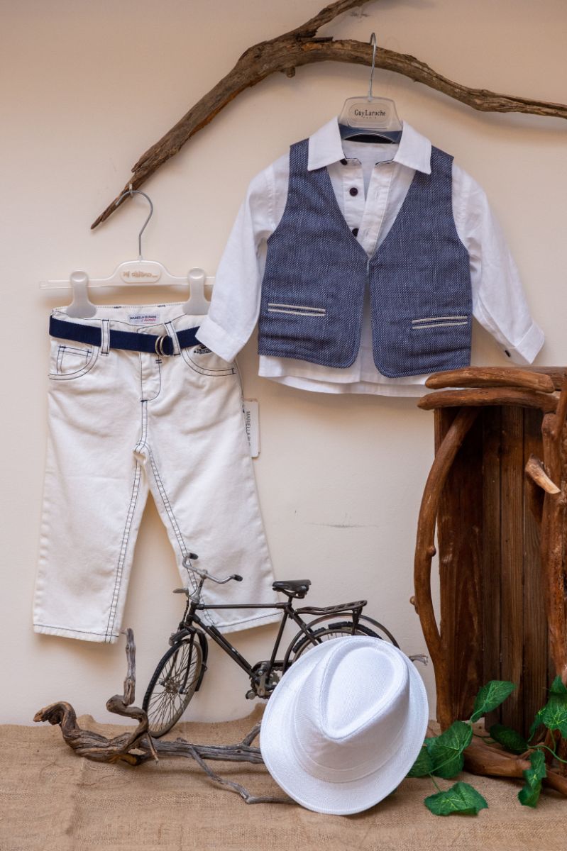 Κομψό και μοντέρνο βαπτιστικό σύνολο από τζιν λευκό παντελόνι, με όμορφο γιλέκο σε απόχρωση του μπλε. Είναι διακοσμημένο με υπέροχα κουμπιά και μοναδικές λεπτομέρειες. Αυτό το σετ 5 τεμαχίων (παντελόνι,πουκαμίσα, γιλέκο, καπέλο και ζώνη), είναι μια δροσερή καλοκαιρινή πρόταση για ειδικές περιστάσεις όπως η βάπτιση. • Παντελόνι: τζιν