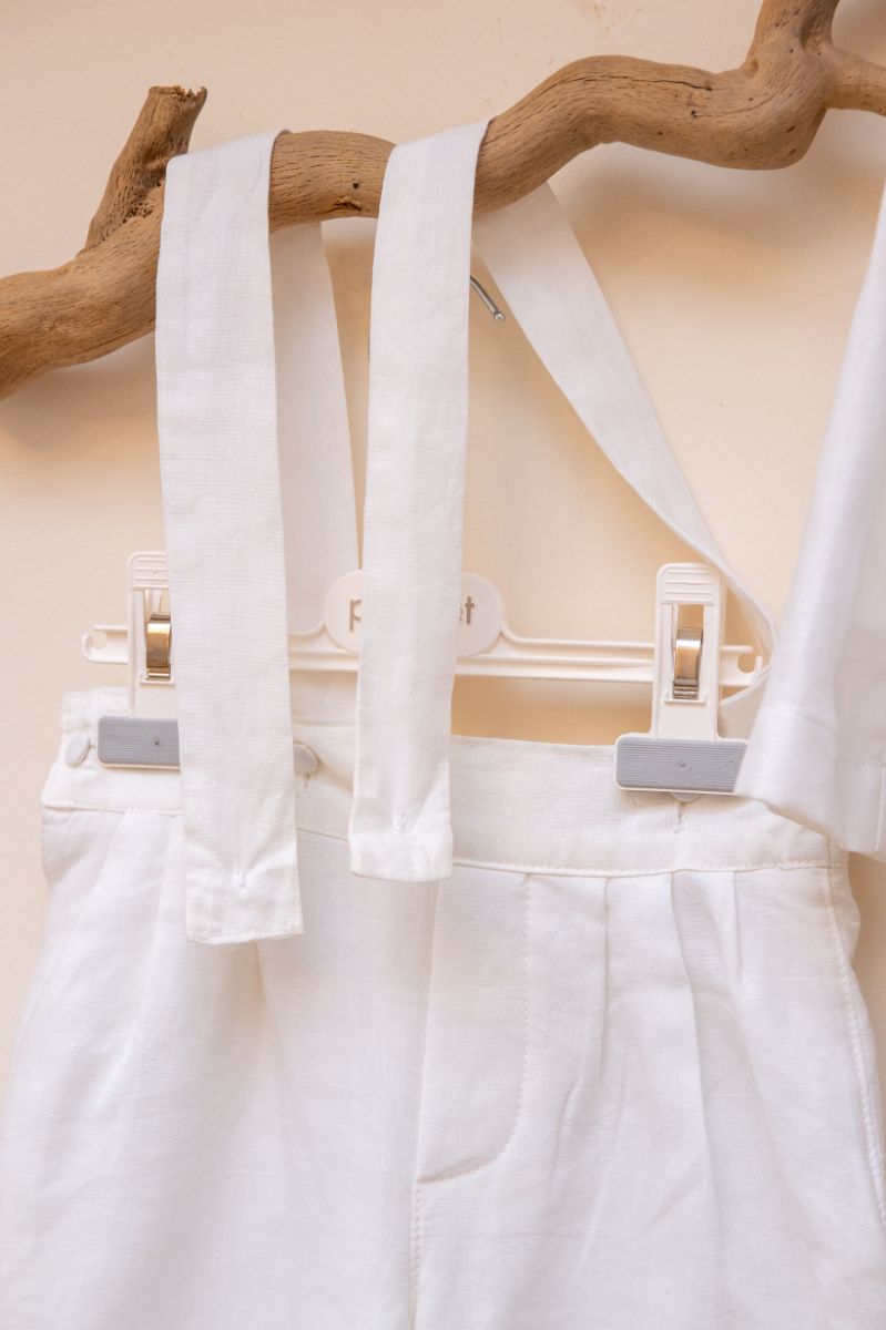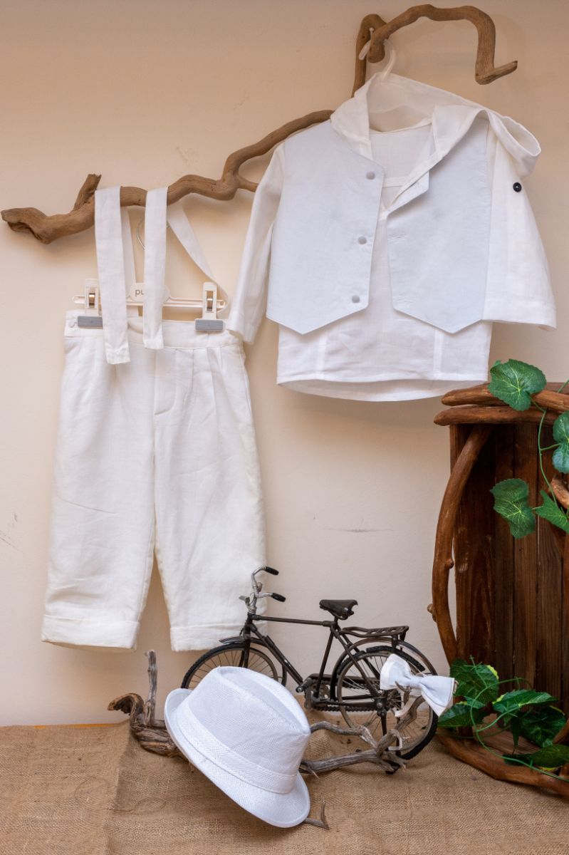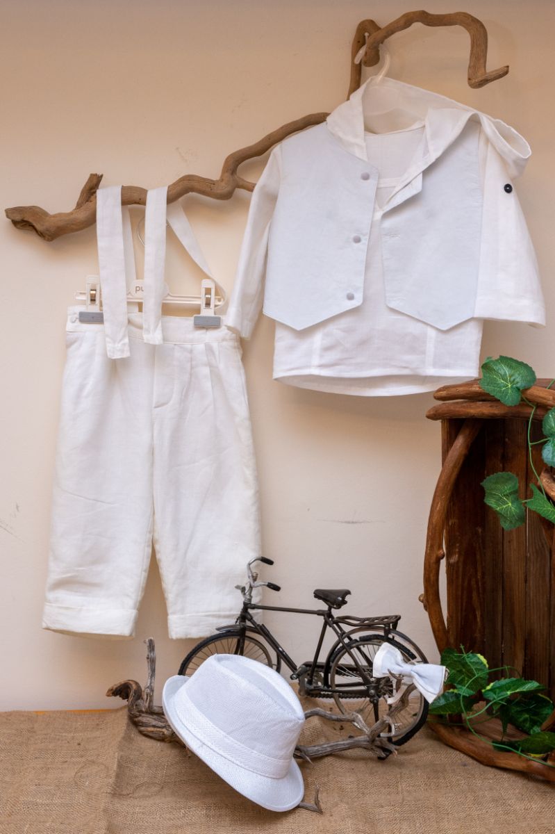 Κομψό και μοντέρνο βαπτιστικό σύνολο από 100% Λινό (master of European linen) λευκό παντελόνι, με όμορφο γαλάζιο γιλέκο. Αυτό το σετ 5 τεμαχίων (παντελόνι με τιράντες,πουκάμισο, γιλέκο, παπιγιόν και καπέλο), είναι μια δροσερή καλοκαιρινή πρόταση για ειδικές περιστάσεις όπως η βάπτιση. • Παντελόνι: 100% Λινό
