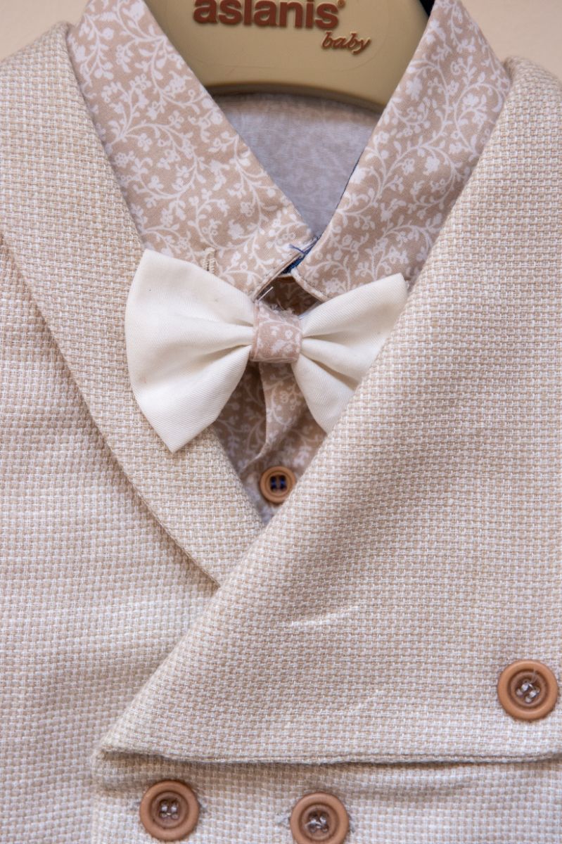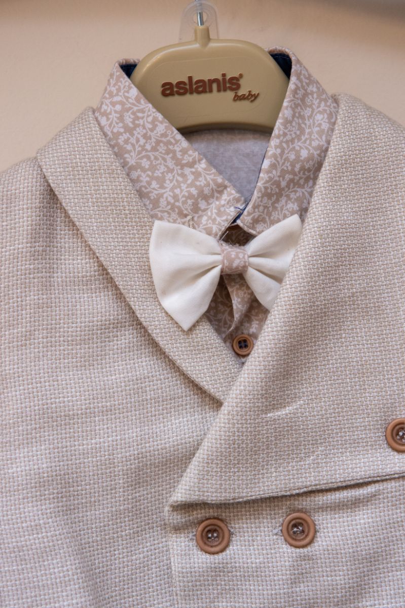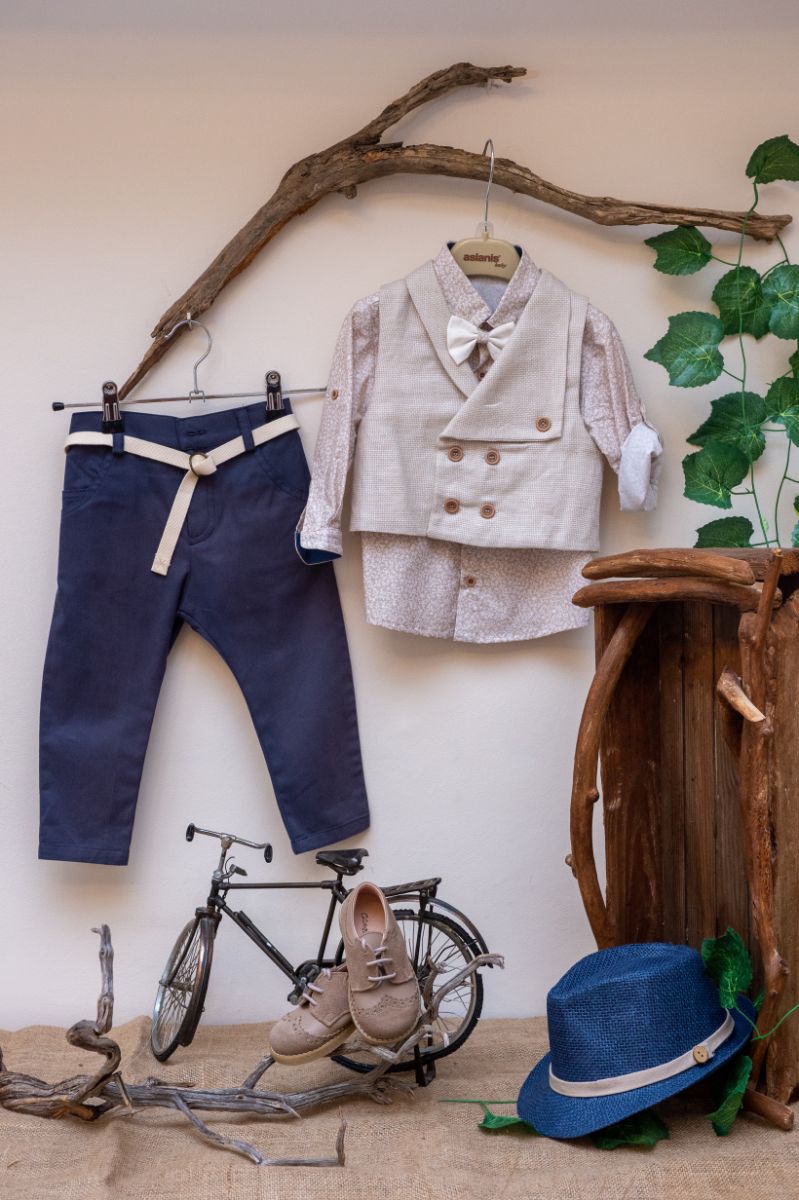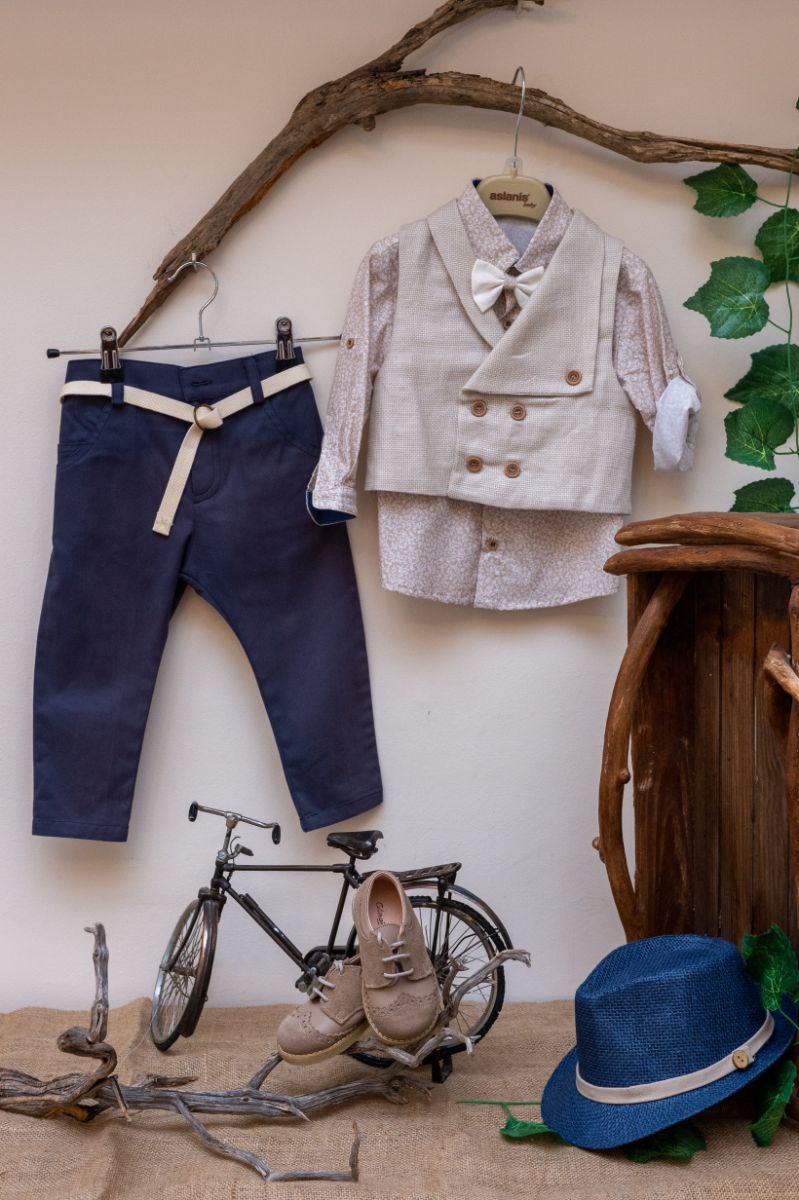 Κομψό και μοντέρνο βαπτιστικό σύνολο από υφασμάτινο μπλε παντελόνι, με όμορφο γιλέκο σε απόχρωση του μπεζ. Είναι διακοσμημένο με υπέροχα κουμπιά και μοναδικές λεπτομέρειες. Αυτό το σετ 6 τεμαχίων (παντελόνι,πουκάμισο, γιλέκο, παπιγιόν, καπέλο και ζώνη), είναι μια δροσερή καλοκαιρινή πρόταση για ειδικές περιστάσεις όπως η βάπτιση. • Παντελόνι: Υφασμάτινο